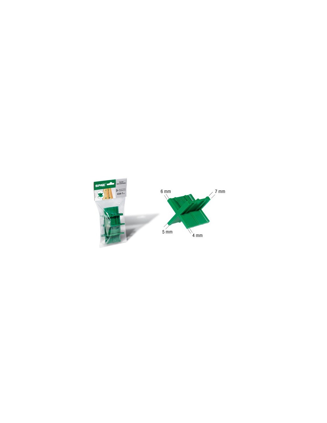 Dištančná podložka SPAX je univerzálny produkt s možnosťou zhotovenia medzier v štyroch šírkach: 4,5, 6 a 7 mm. Šírka medzery závisí od vlhkosti dreva. Vlhké drevo - medzera je menšia, suché drevo - medzera väčšia.