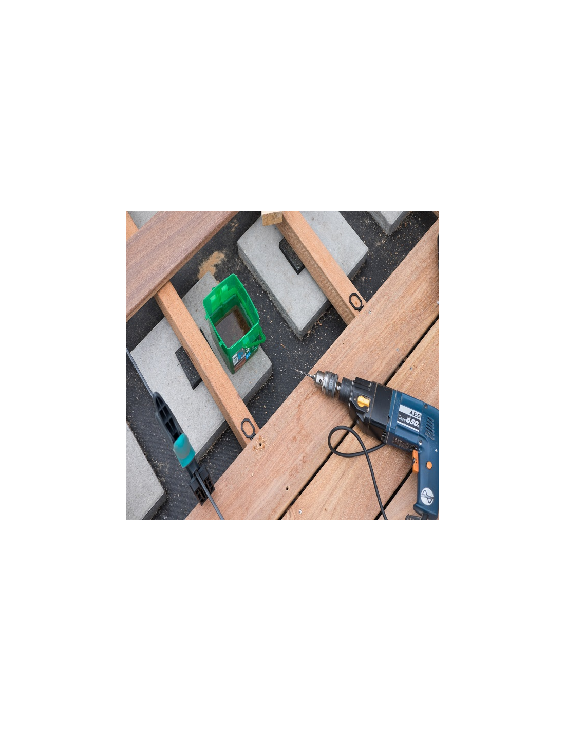 - terasovú dosku a trám navŕtajte dvojstupňovou vŕtačkou SPAX pri maximálnej rýchlosti skrutkovača (cca 3000 ot./min.)