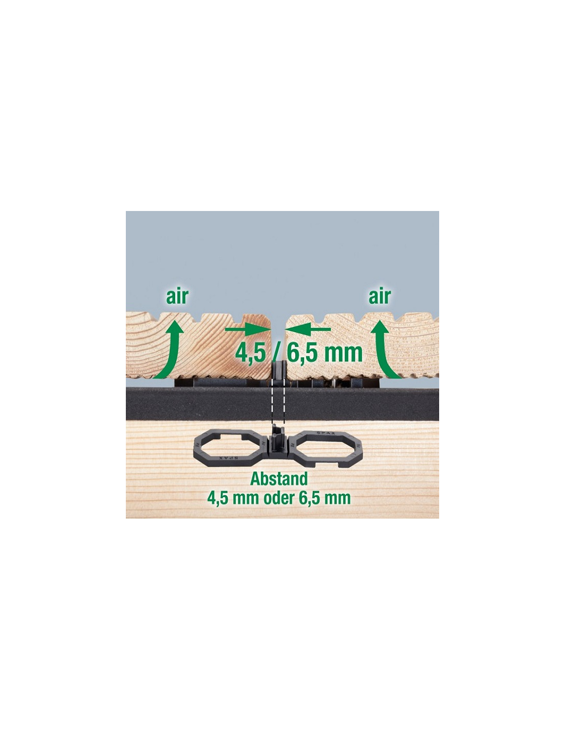 Dištančné podložky SPAX AIR 6,5 mm poskytujú 6,5 mm medzeru medzi doskami a zvyšujú ich až k nosníkom o 4 mm .