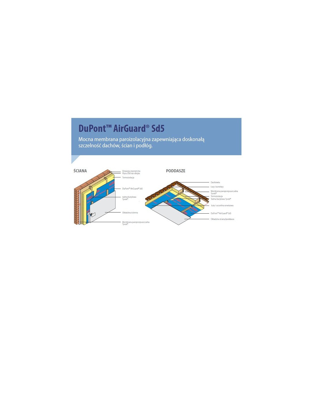 DuPont ™ Tyvek® AirGuard® Sd5 parotesná fólia je silná parotesná membrána zaisťujúca dokonalú tesnosť striech, stien a podláh. Použitie DuPont ™ AirGuard® Sd5 eliminuje konvekčné tepelné straty. Membrána DuPont ™ AirGuard® Sd5 bola špeciálne vyvinutá na použitie ako vzduchotesná bariéra s riadením toku vodnej pary. Izolačný systém na báze DuPont ™ AirGuard® Sd5 sa vyznačuje zvýšenou schopnosťou vysušovania konštrukcie. Kombinácia parozábrany DuPont ™ AirGuard® Sd5 inštalovanej vo vnútri budovy a paropriepustnej membrány DuPont ™ Tyvek® z vonkajšej strany drevenej rámovej konštrukcie je nevyhnutná pre ochranu pred vetrom a vlhkosťou.